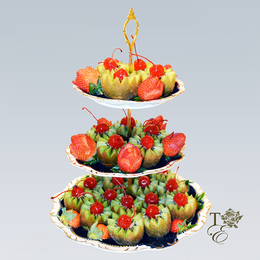This tiered arrangement is suitable for dessert tables for any occasion. Add a little "oomph" to your fruit presentation and enjoy the tangy kiwi and sweet cherry. Turn what is ordinary into extraordinary with this tiered piece. Simple, healthy, and delicious!
