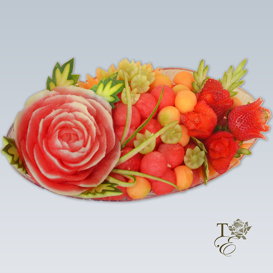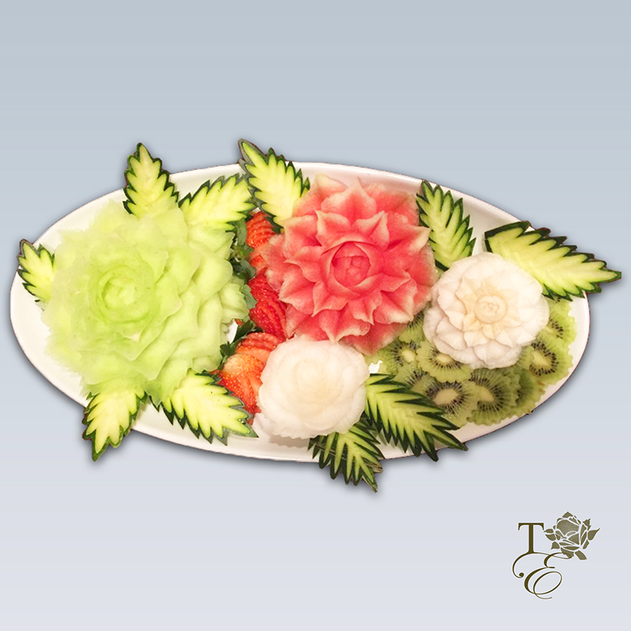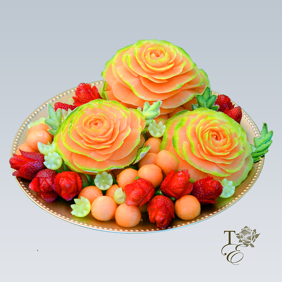 This beautiful platter encompasses a gorgeous tri-floral arrangement. This dessert is healthy and gluten free just like all of our elegant carvings! The strawberry roses are a great addition of sweetness and aesthetics.
