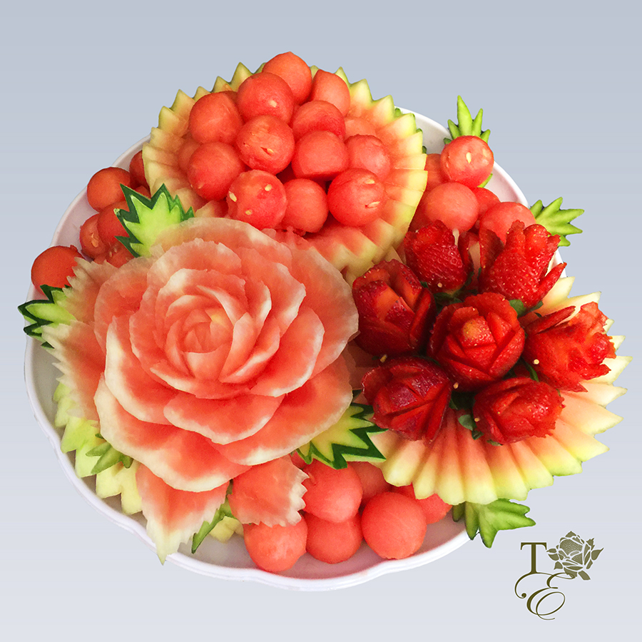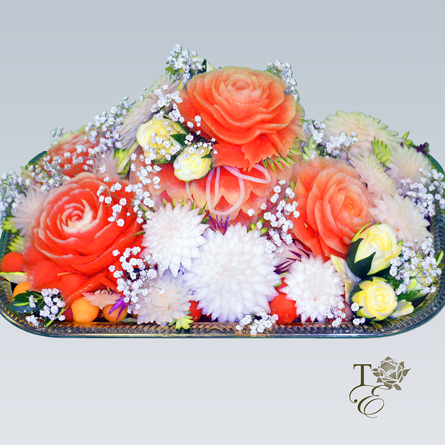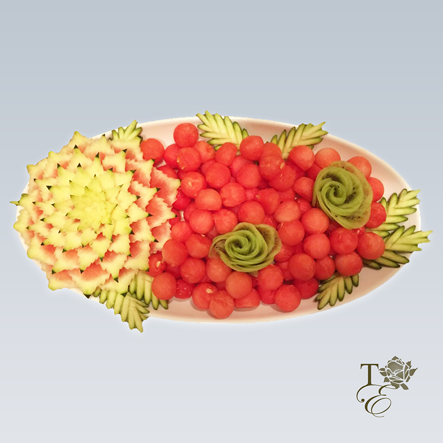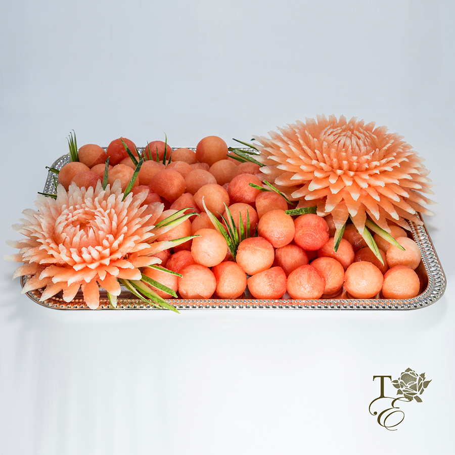 This platter encompasses two carved chrysanthemums, pattern carved cake, watermelon peel décor, and melon and watermelon balls. Entails gorgeous detail work for all your guests to admire and taste.
