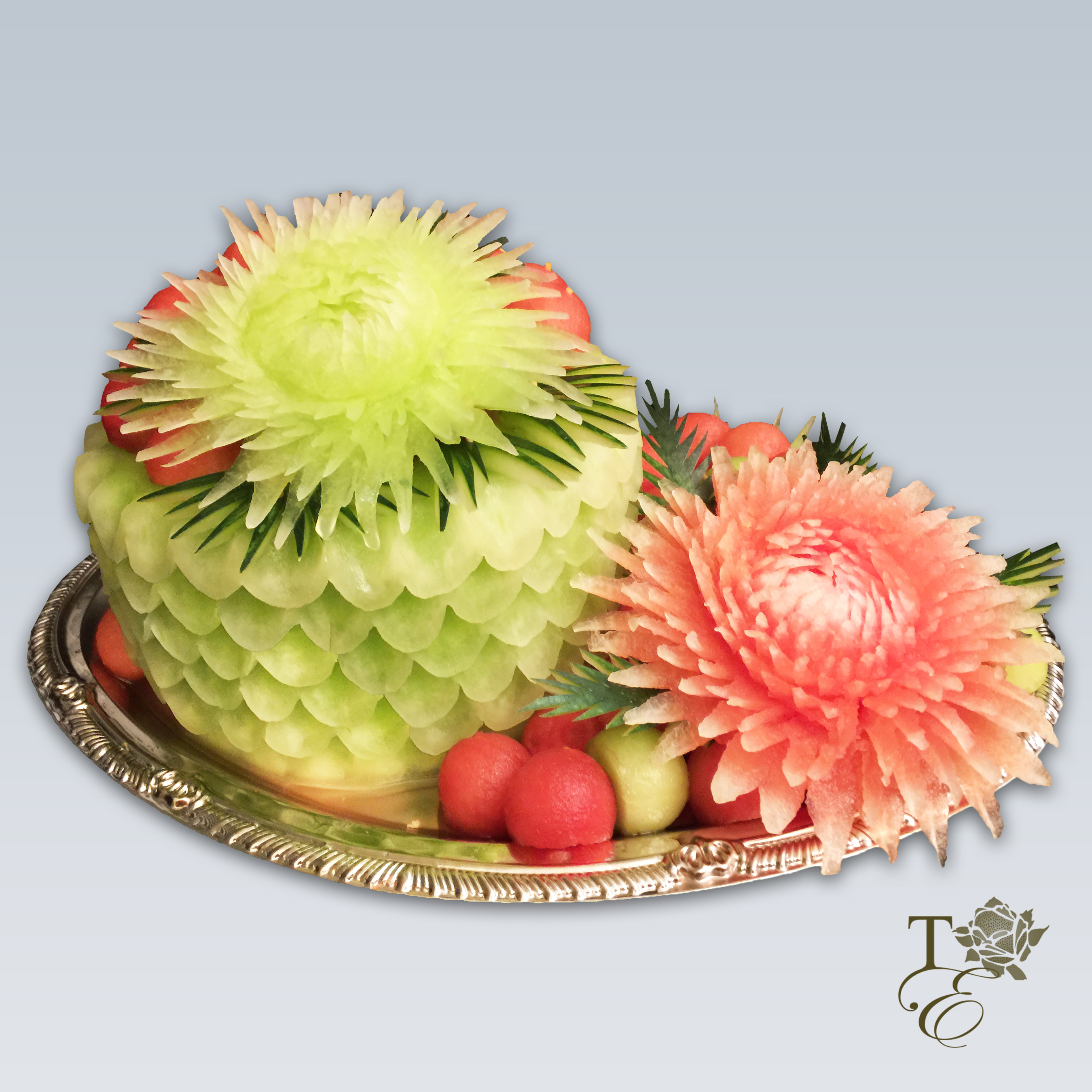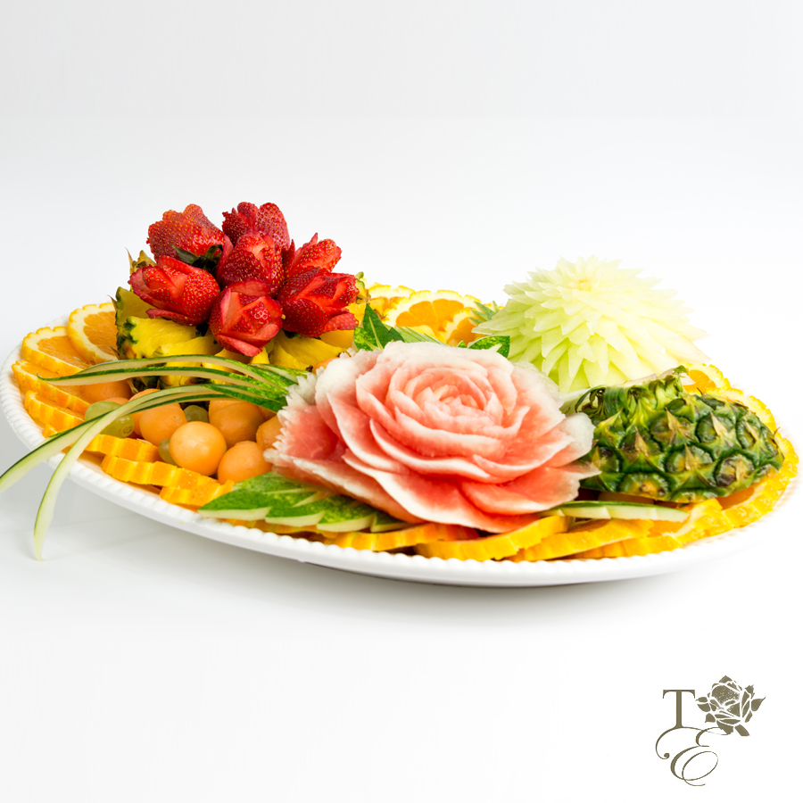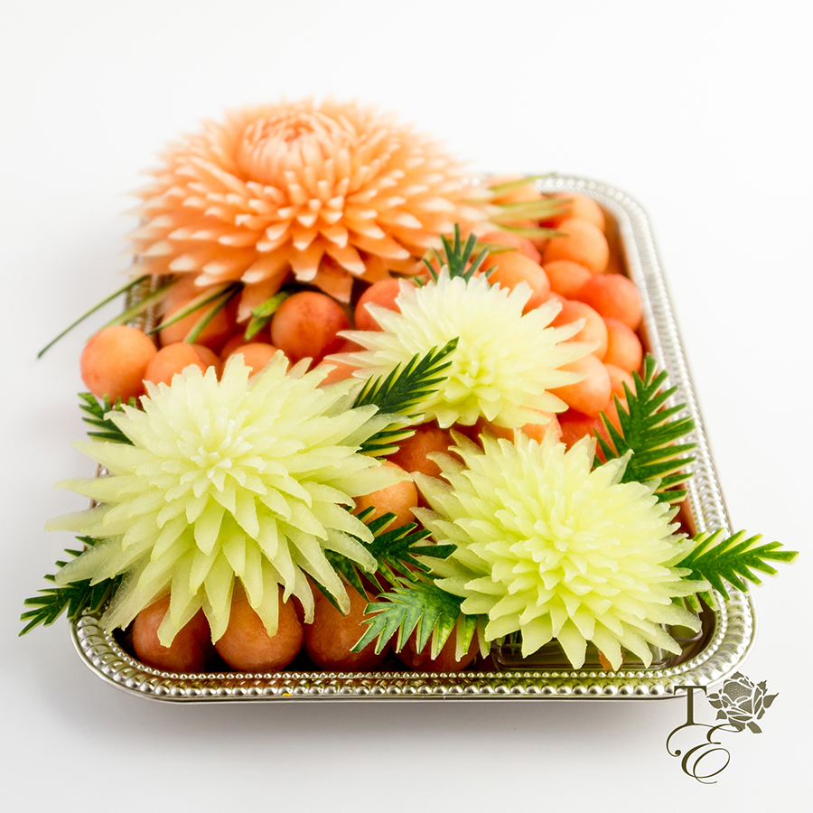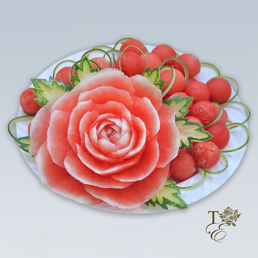 This platter encompasses two carved chrysanthemums, pattern carved cake, watermelon peel décor, and melon and watermelon balls. Entails gorgeous detail work for all your guests to admire and taste.