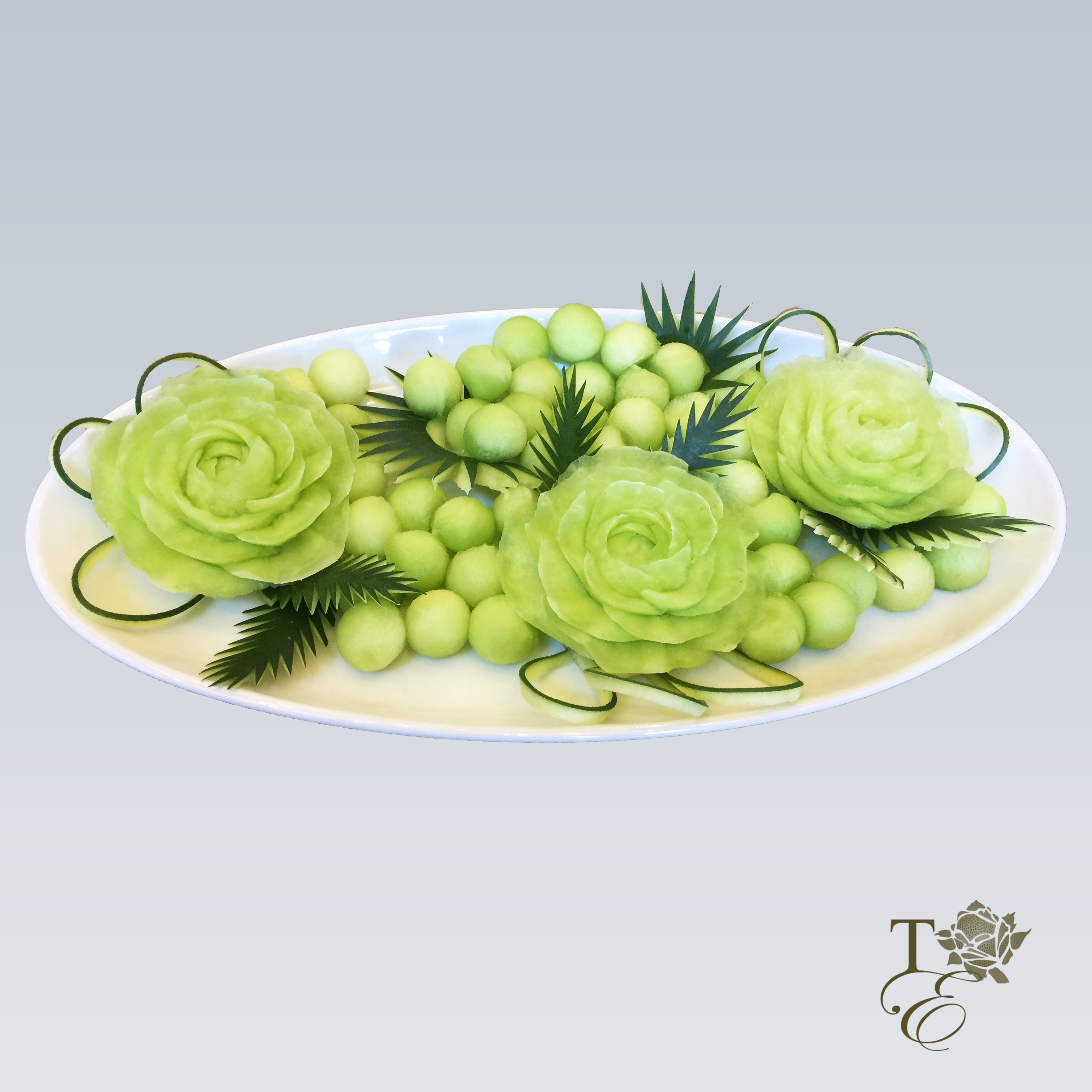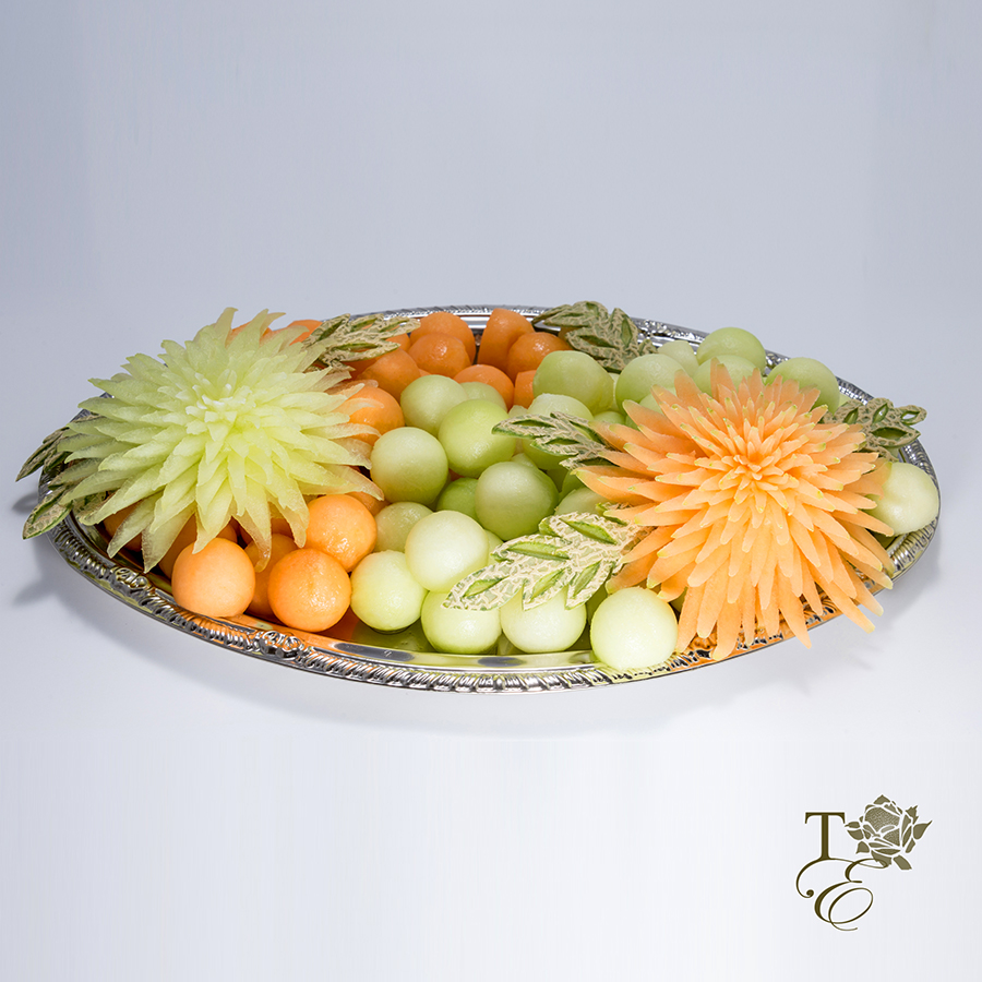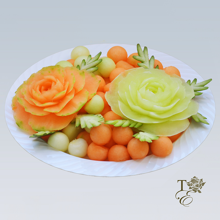 This bright green platter uses only fresh melon to create such a wonderful work of art. Floral designs, fruit peel leaves, and melon balls are perfectly arranged to create this beautiful platter. ***Custom sizes available.