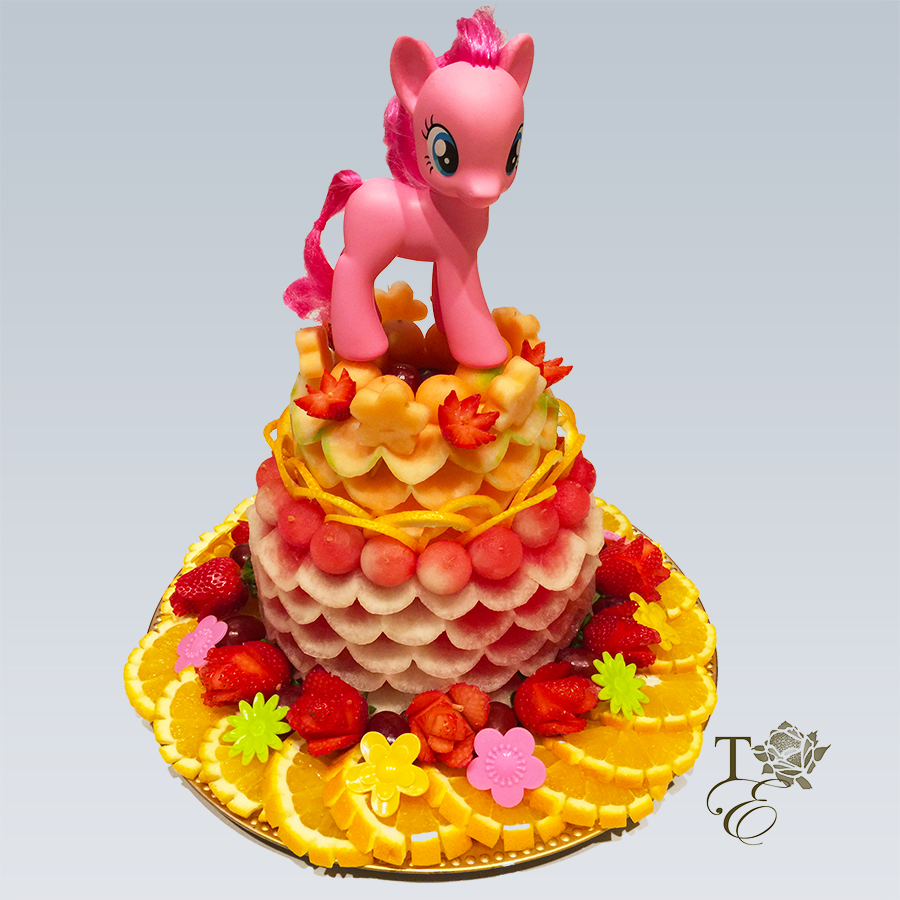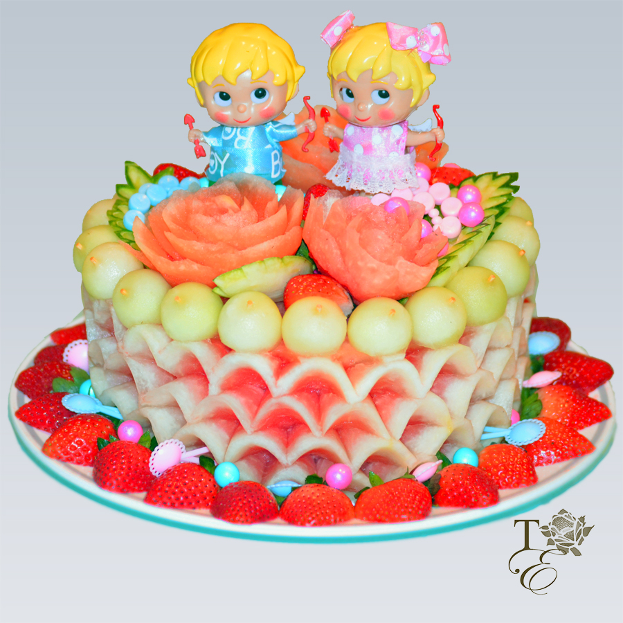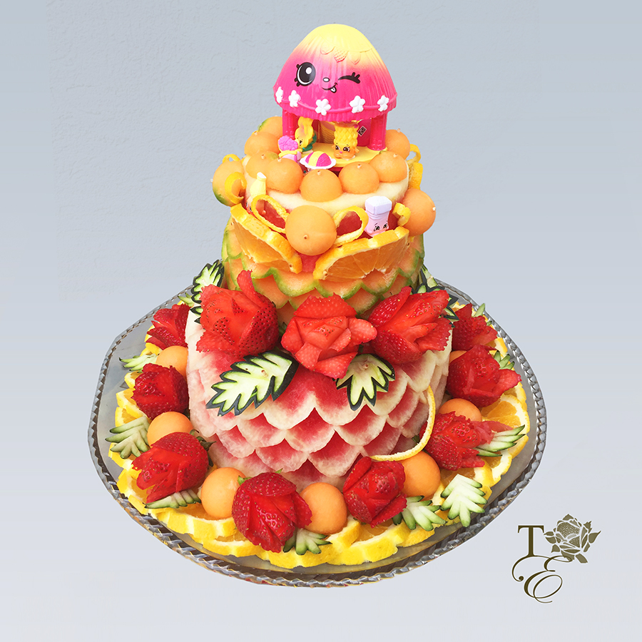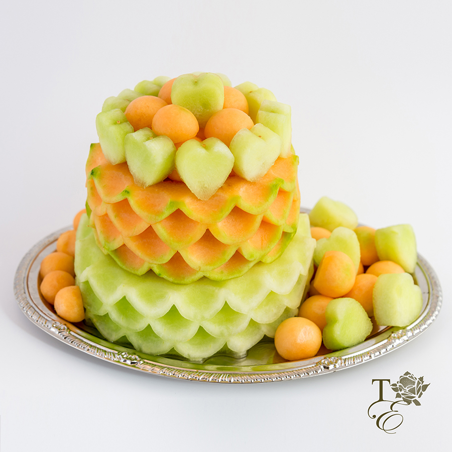 Such a gentle color scheme that is perfect for birthdays, baby showers, and any special occasions. Our layered cake is healthy, delicious, and unique with an assortment of heart shaped melon and cantaloupe balls.