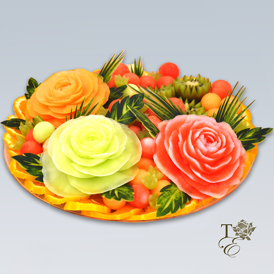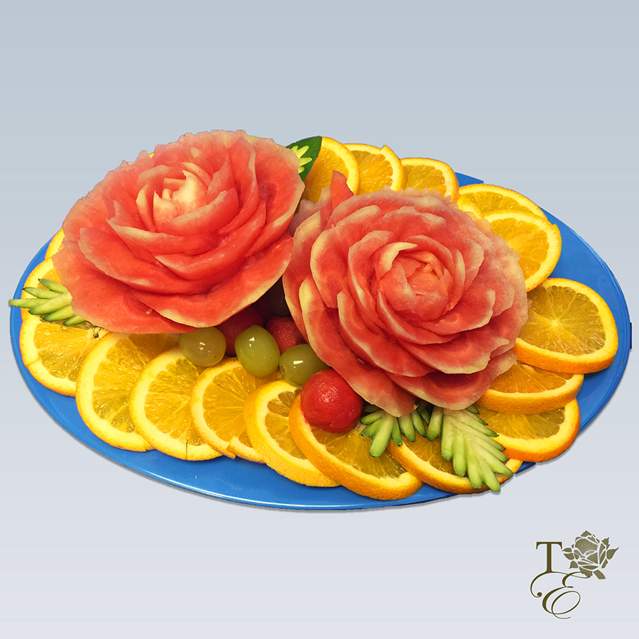 This Elegant fruit platter encompasses a large green tinted detailed floral carving, kiwi roses, watermelon balls, and peel decor. An aesthetic addition to any celebration or event. ***Custom sizes available.