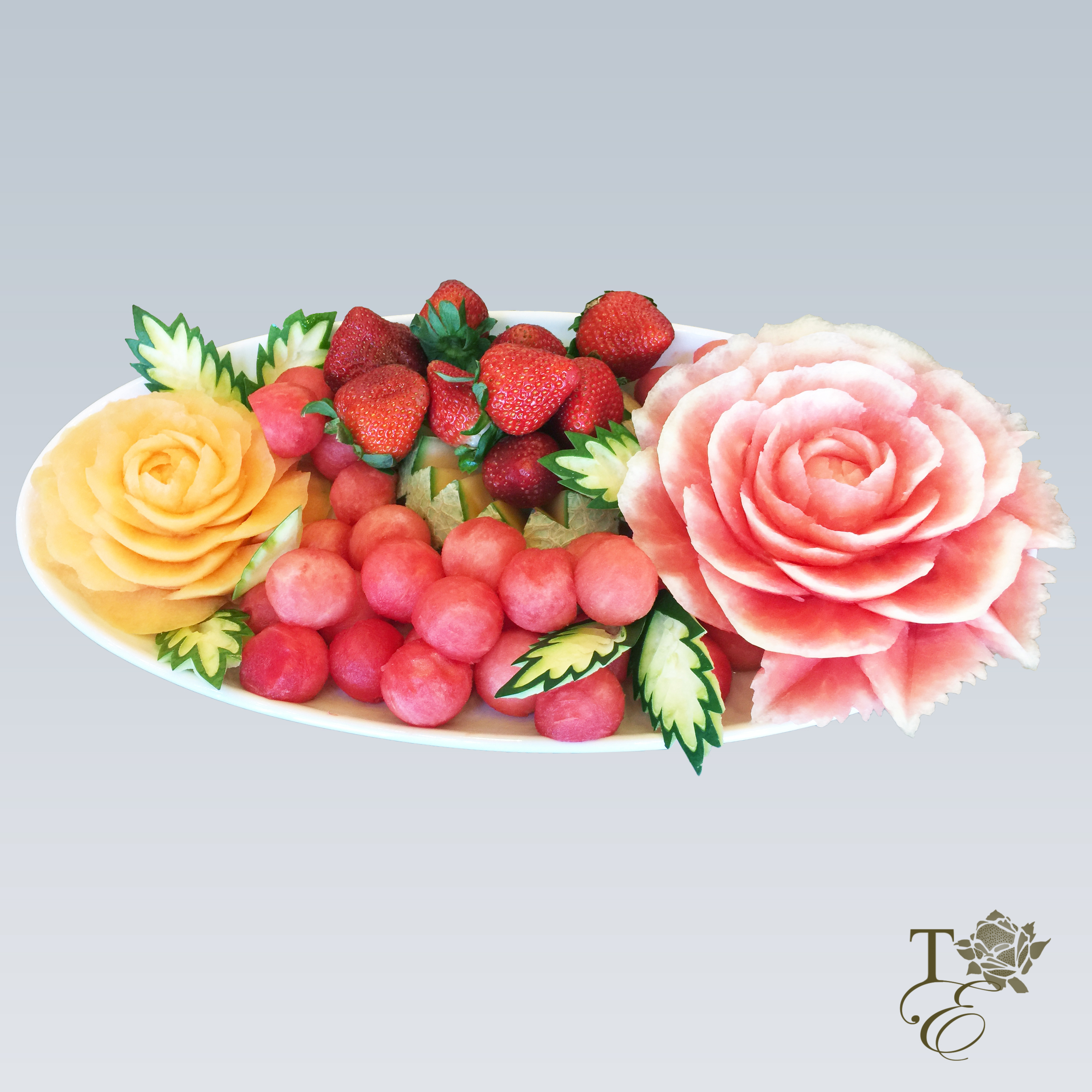 This elegant fruit platter encompasses two carved cantaloupe baskets with a berry assortment filling, rose carved strawberries, cantaloupe balls, and melon peel décor. **Custom sizes available.