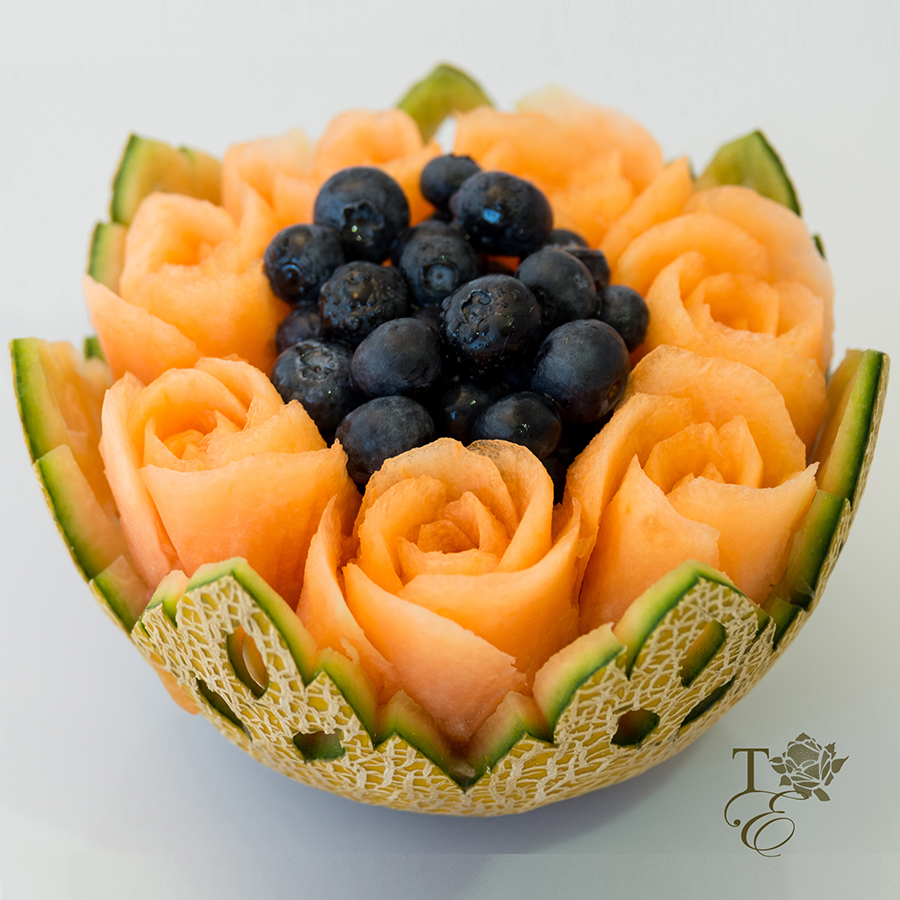 This alluring vase is carved to produce gorgeous roses from the interior of the cantaloupe with stylistic leaf patterns using the outer skin. The vase is then filled with any berries of your choosing: strawberries, blueberres, raspberries, blackberries, cranberries, etc. Use it as a center piece for any dessert table or gift.
