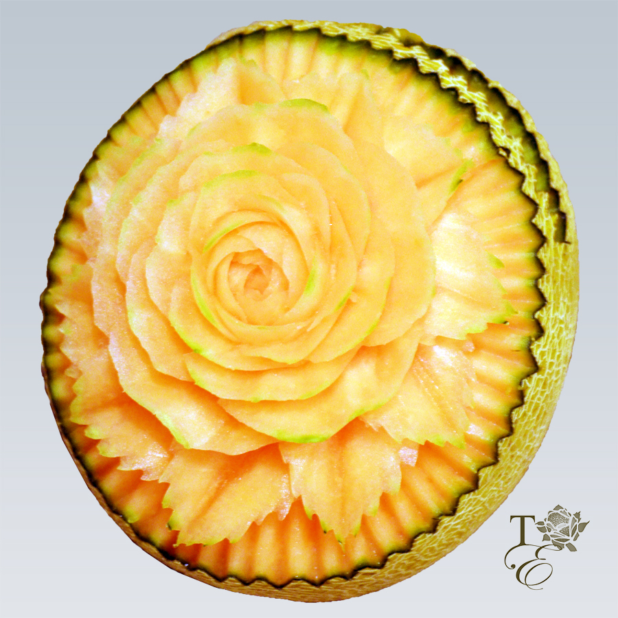This decorative and edible carving creation is a beautiful table enhancer. The sweet taste of cantaloupe in combination with the aesthetic carving of a rose is a choice you can't go wrong with for a dessert table. This piece shouts "look at me"; stand out with our wonderful creations.
