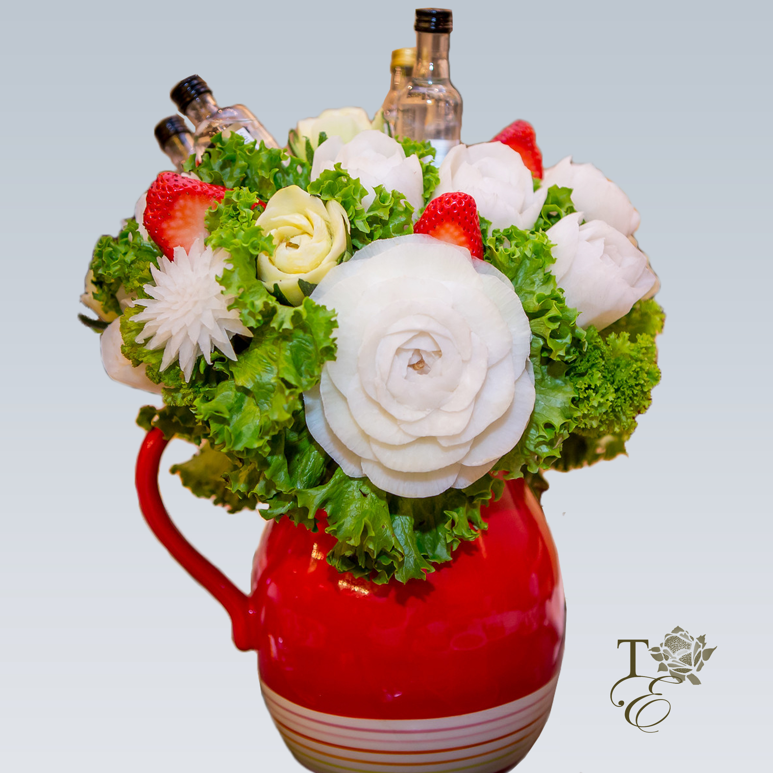 The cute vase is filled with beautiful floral carvings and accentuated with mini vodka bottles! With a beautiful color contrasting combination of red, green, and white, this piece is perfect for accenting any table and can even be gifted on its own as an edible and elegant floral bouquet with a drink.