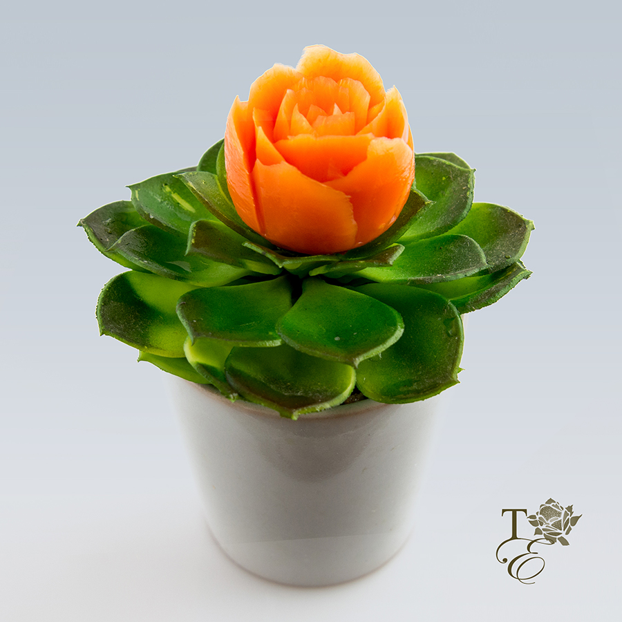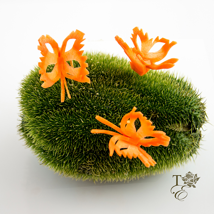 This beautiful arrangement of florals, cones, and leaf carvings has a beautiful fall color scheme. The bright orange, deep purples, natural greens, and whites would accent any Halloween, Thanksgiving, or any Holiday table!